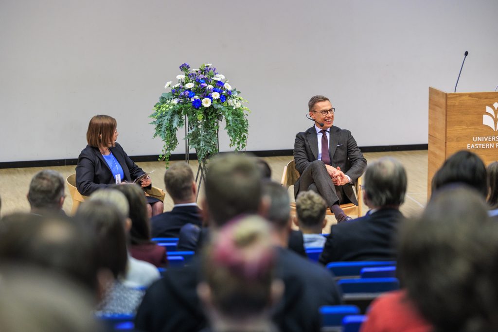 Iltapäivällä presidentti Stubb puhui yleisölle Itä-Suomen yliopistolla otsikolla Muuttuva voimatasapaino: arvot, intressit ja valta ulkopolitiikassa. Hän hahmotteli ulkopolitiikkaan vaikuttavaa maailman järjestystä, tasapainoa ja dynamiikkaa. Luennon ja sitä seuranneen mediatilaisuuden yhteydessä presidentti käsitteli ajankohtaisia teemoja ulko- ja turvallisuuspolitiikasta Itä-Suomen elinvoimaan. Hän korosti, että Itä-Suomi on koko maan turvallisuuden kannalta keskeinen alue.