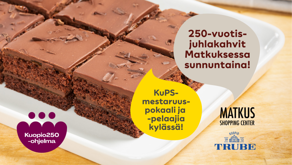 Kauppakeskus Matkus juhlistaa Kuopion merkittävää juhlavuotta tarjoamalla kakkukahvit kaikille kaupunkilaisille sunnuntaina 16.11. Tapahtuma järjestetään Matkuksen ensimmäisessä kerroksessa apteekin edustalla, jossa tarjolla on Truben suklaakakkuja ja kahvia yhteensä 2500 kävijälle. Juhlatarjoilun yhteyteen on lisäksi piilotettu yllätyksiä, sillä osasta kupeista ja lautasista voi paljastua Matkuksen lahjakortteihin oikeuttavia palkintoja.
