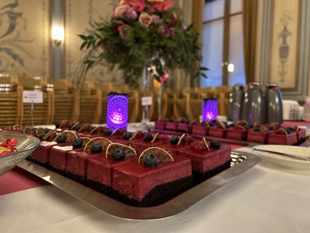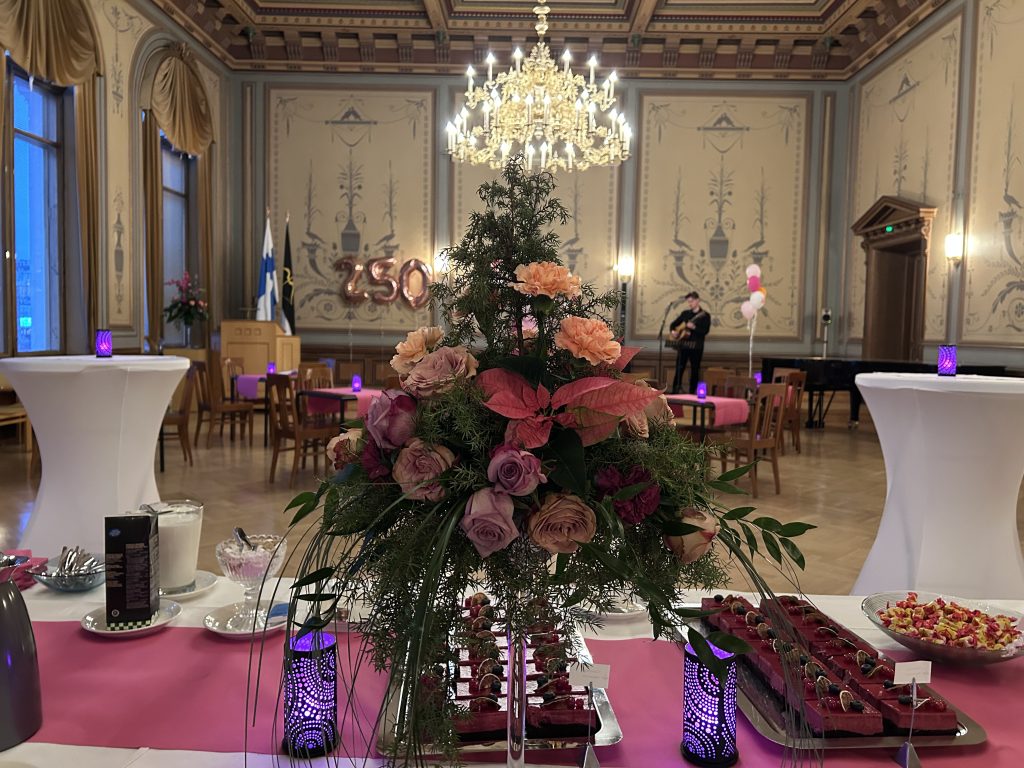 Juhlahetkeen kuuluivat luonnollisesti myös kakkukahvit. Tarjolla oli Truben leipomon Kuopio250-juhlavuoden leivos, joka sopi täydellisesti tapahtuman teemaan. Herkuttelun lomassa osallistujat tutustuivat toisiinsa ja vaihtoivat kuulumisia nauttien musiikista ja yhdessäolosta.
