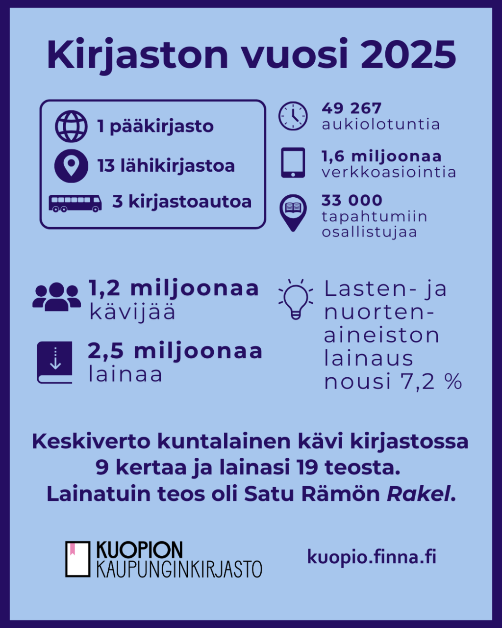 Keskiverto kuntalainen kävi kirjastossa 9 kertaa ja lainasi 19 teosta. Lainatuin teos oli Satu Rämön Rakel. Suurin kiitos ennätyksellisestä lainausvuodesta 2025 kuuluu kirjaston aktiivisille asiakkaille sekä asiantuntevalle henkilökunnalle.