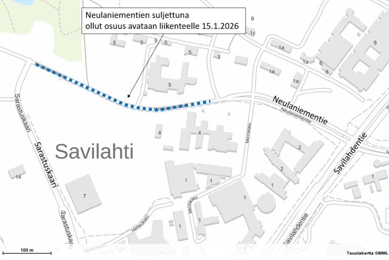 Neulaniementien rakennustyöt ovat toistaiseksi päättyneet ja Neulaniementie avataan liikenteelle torstaina 15.1.2026.
