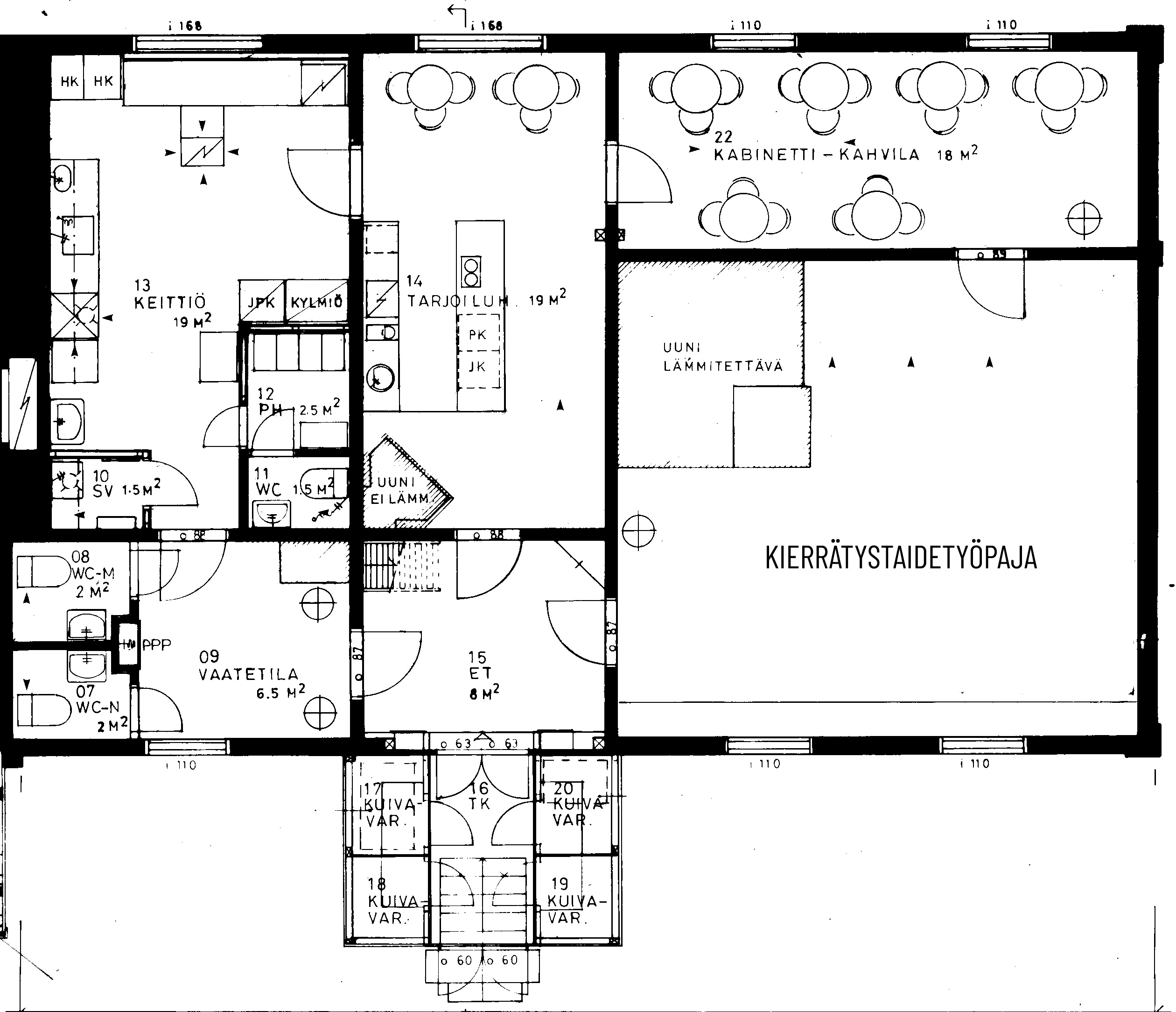 - Yhteensä 56 m², sisältäen kahvilan tarjoilutilan 19 m², kabinettitilan 18 m² (n. 20 asiakaspaikkaa) ja keittiön 19 m².