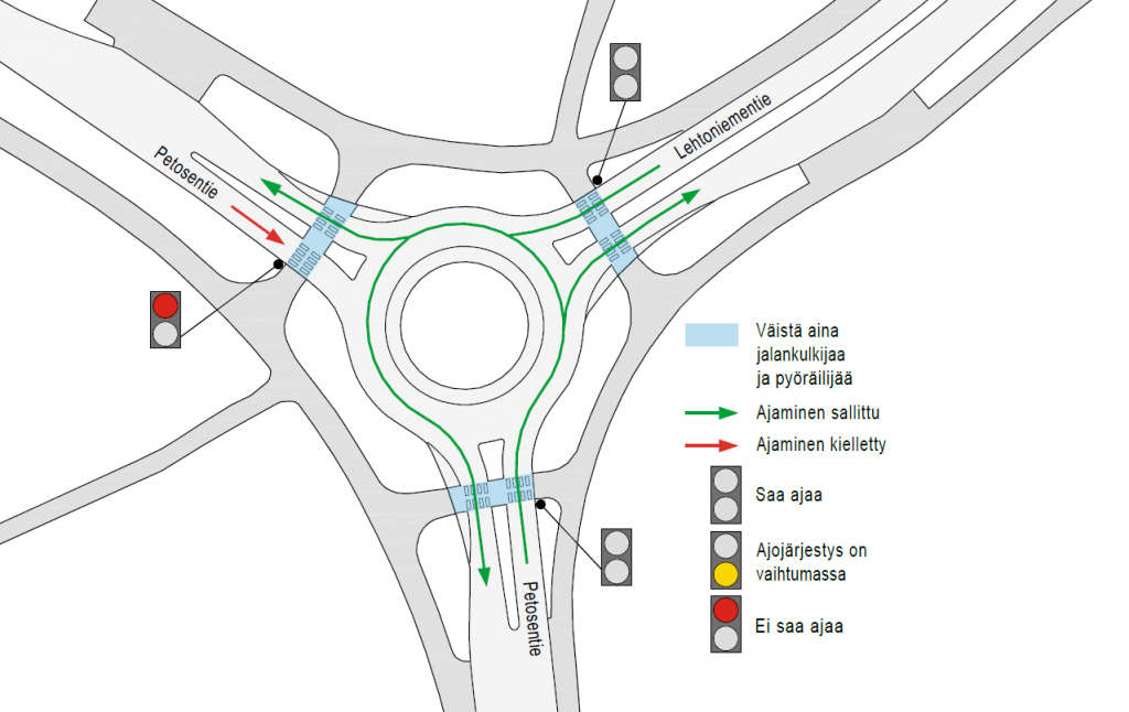 Esimerkiksi kun Petosentiellä etelän suunnassa on ruuhkaa, niin punainen valo syttyy edelliselle liikenneympyrän haaralle, eli tässä tapauksessa Petosentielle luoteen suunnalle (kts. piirroskuva). Kun ruuhka on saatu purettua, punainen valo sammuu Petosentien haaralta ja liikenneympyrässä ajetaan normaalien liikennesääntöjen mukaan.