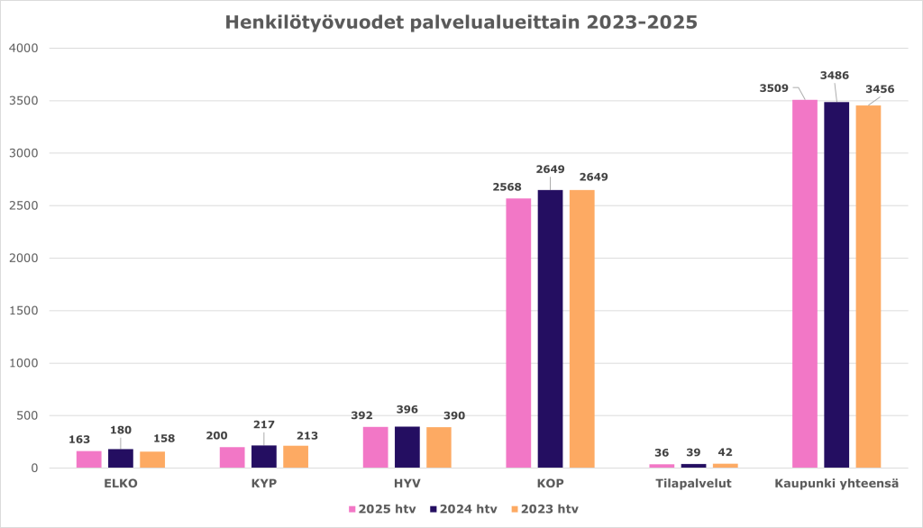 Henkilötyövuodet vähenivät Elinvoima- ja konsernipalvelujen (- 17 htv), Kaupunkiympäristön (- 17 htv), Hyvinvoinnin edistämisen (- 4 htv) sekä Kasvun ja oppimisen (- 81 htv) palvelualueilla ja Tilapalveluissa (- 3 htv) verrattuna vuoteen 2024. Ydinkaupungin henkilöstö väheni 119 henkilötyövuotta. Vuoden 2025 alussa siirtyi TE-uudistuksen vuoksi valtiolta liikkeenluovutuksella henkilöstöä Työllisyysalueelle, josta henkilötyövuosiin tuli kasvua (+145 htv).
