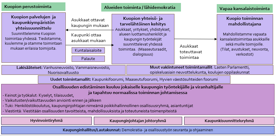 Asukasosallisuus toteutuu Kuopion perustoiminnassa, aluedemokratiassa ja vapaassa kansalaistoiminnassa.