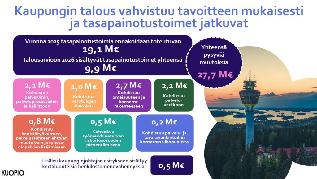 - Kuopion kaupungin talouden tasapainotustyö jatkuu, 16.1.2024 Tämä linkki aukeaa uuteen välilehteen